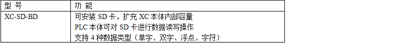 XC系列PLC適配左擴(kuò)展BD板,可接入一個(gè)SD卡。 XC系列PLC一般可擴(kuò)展1個(gè)BD板。 實(shí)現(xiàn)SD卡與PLC間數(shù)據(jù)的讀寫,主要為存儲備份數(shù)據(jù)用 支持最大2GB SD卡 XC本體軟硬件版本要求為V3.2及以上